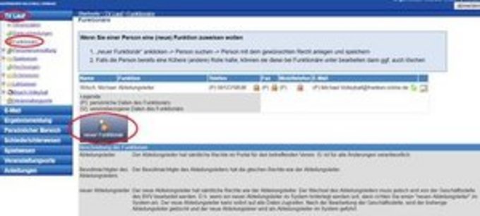 - Unter Eurem Vereinseintrag gibt es den Punkt "Funktionäre". Klickt dort auf "neuer Funktionär". (Bild 2)